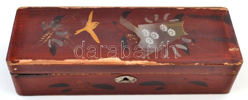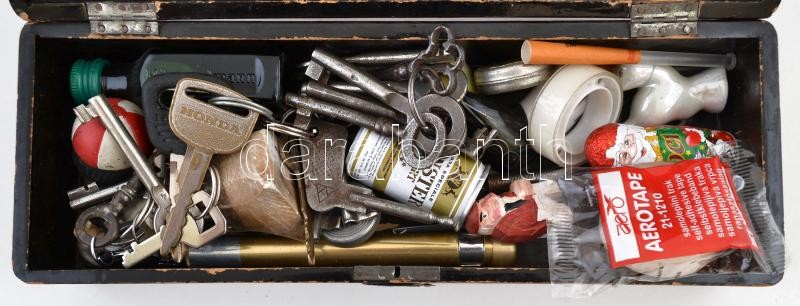 Beschreibung: Vegyes bolhapiac tétel: régi kulcsok, kerámia egyebek fa dobozban