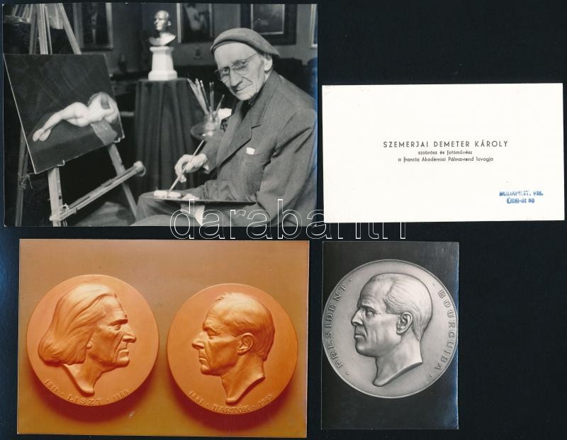 Beschreibung: Szemerjai Demeter Károly szobrász és festőművészről és műveiről készült fotók + 1 db névjegykártya, 8x6 és 13x18 cm közötti méretekben