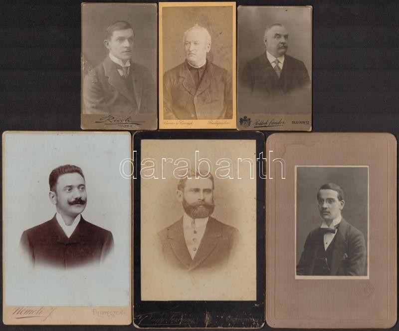 cca 1870-1900 Vegyes férfi portré tétel, 6 db, keményhátú fotók, Németi József (Debrecen), Nagy Ferenc (Esztergom), Botfan M. (Bp.), Rivoli (Nyitra), Pottok Sándor (Bp.), Borsos és Varságh, 16x11 cm és 10x6 cm közötti méretben.