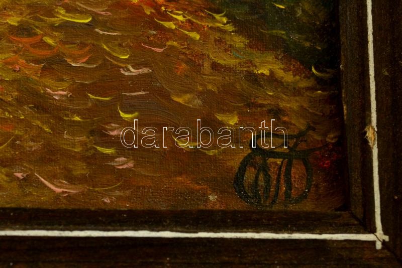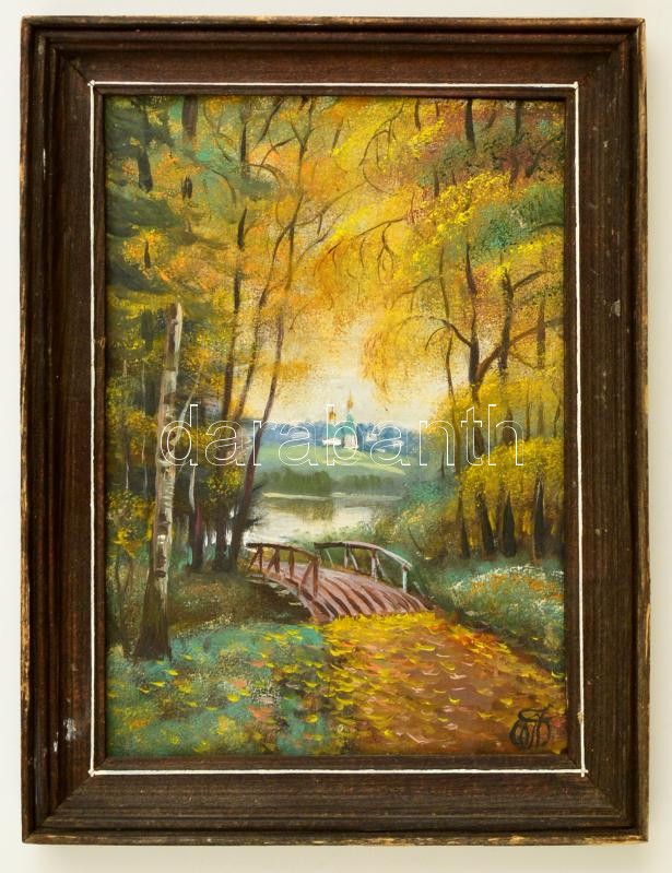 Szolovjov, A[lekszandr?]: Őszi tájkép híddal, olaj, fa, jelzett, keretben, hátulján feliratozva, 17,5×12,5 cm / Solovyov, A[leksandr?]: Autumn landscape with bridge, oil on wood, signed, 17,5×12,5 cm