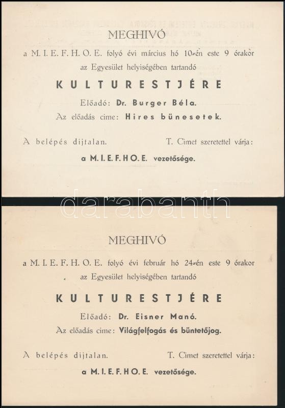 Beschreibung: 1937 A Magyar Izraelita Egyetemi és Főiskolai Hallgatók Országos Egyesületének 2 db meghívója kultúrestre