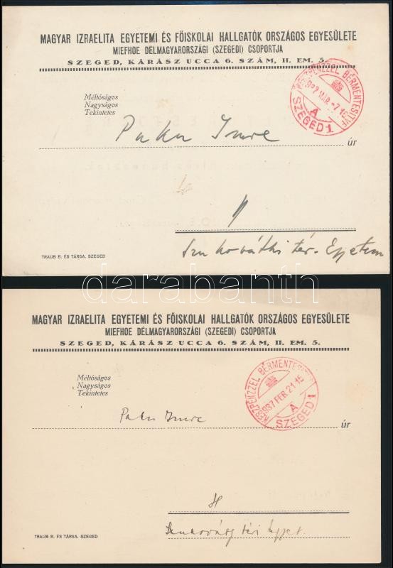 1937 A Magyar Izraelita Egyetemi és Főiskolai Hallgatók Országos Egyes... https://www.darabanth.com/de/306-Fernauktion/306.0/Andere-Sammelgebiete/Judaica~100026/1937-A-Magyar-Izraelita-Egyetemi-es-Foiskolai-Hallgatok-Orszagos-Egyesuletenek-2-db-meghivoj~II1652618