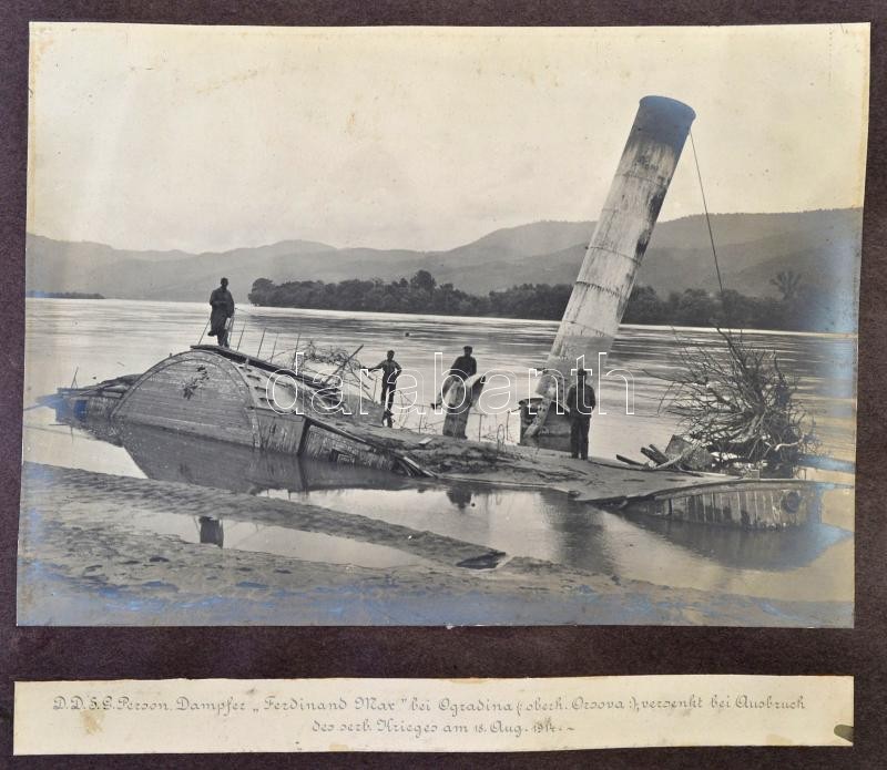 1914-1918 A cs. és kir. folyami flottilla hajókiemelő egységének egyedülálló fotóalbuma. A világháború során elsüllyesztett dunai hadihajók, személy- és teherszállító hajók kiemelésére, javítására szakosodott katonai egység feliratozott képes naplója. Rendkívül izgalmas képanyaggal, több tucat nevesített, részben magyar hajóval, búvárok képeivel, dunai városok képeivel, de nagyrészt ritkán látott hajókat ábrázoló fotókkal. Jó állapotú mappában. 50 darab feliratozott fotót tartalmazó album. A fotók mérete kb 16x12 cm, a dombornyomott borítójú mappa mérete 33x48 cm. Ritka hajózástörténeti dokumentum! Az első borító lejár. / 1914-1914 Picture diary of the k.u.k. Schiffshebeformation aka the military ship looming unit. 50 large photos with rarely seen military and passanger ships on the Danube, mainly on Serbian territory. Images of the ships and the cities around.