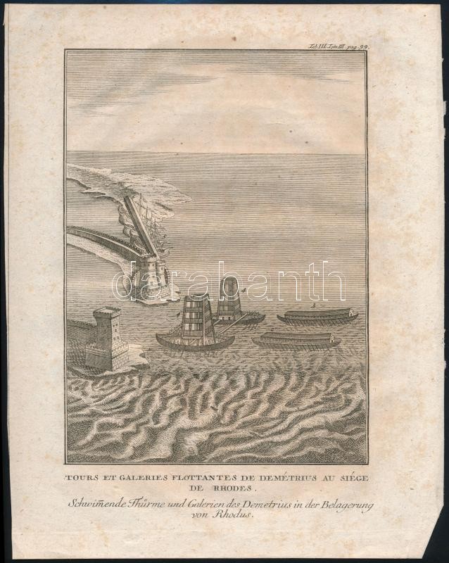 Beschreibung: cca 1750 Ostromhajók Rodosz ostrománál, rézmetszet, papír, az "Histoire de Polybe" kötetből (3. köt. 99. p., 3. t.), 25×20,5 cm