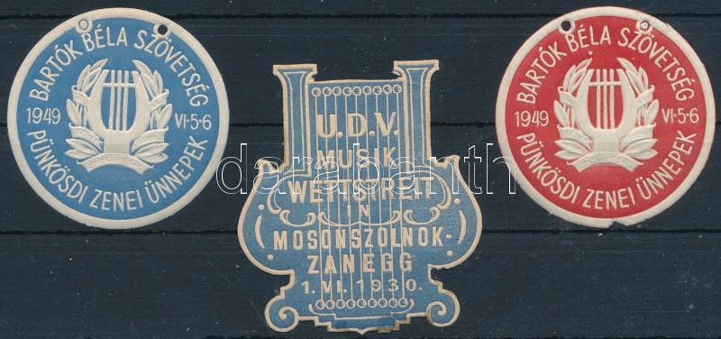 Beschreibung: 1930-1944 Zenei levélzáró + 2 db zenei kitűző dombornyomással