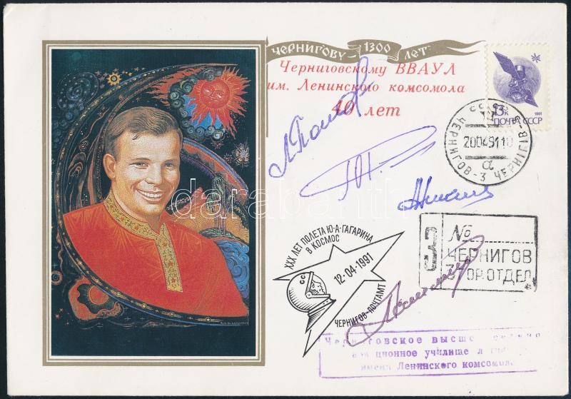 Jurij Viktorovics Romanyenko (1944- ), Adrijan Nyikolajev (1929-2004), Pavel Popovics (1930-2009) és Leonyid Popov (1945- ) szovjet űrhajósok aláírásai emlékborítékon /