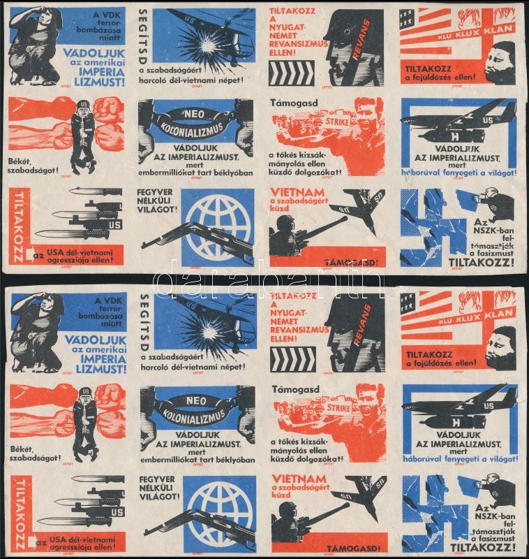 Beschreibung: Antiimperialista és antimilitarista reklámok vágatlan gyufacímkéken, 2 ív