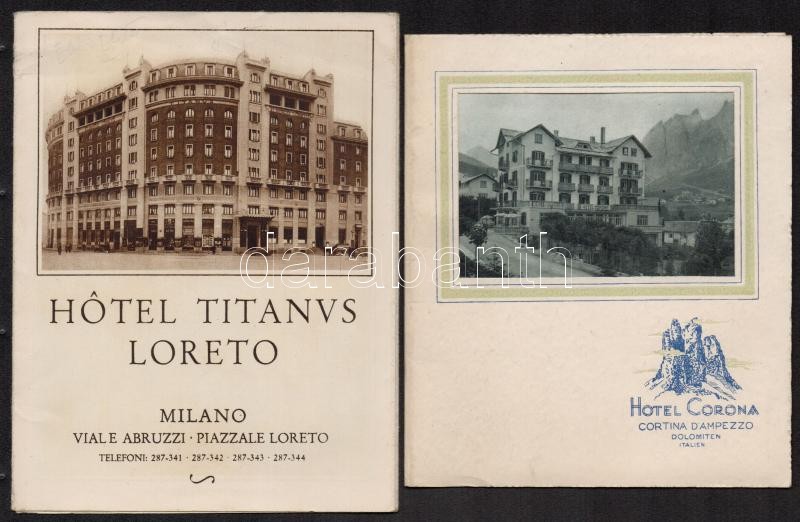 Beschreibung: cca 1930 2 db hotel reklám nyomtatvány: Hotel Corona Cortina D'Ampezzo, Hotel Titanus Loreto Milano