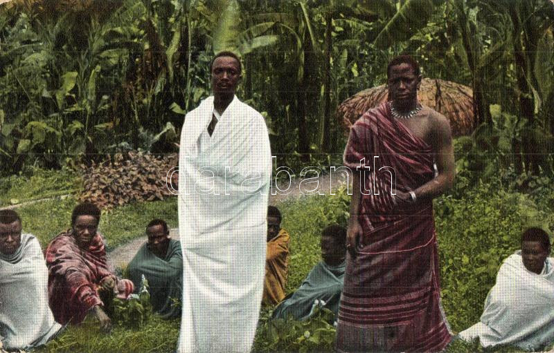 Beschreibung: Häuptling Nkulelo und Schangali mit ihren Altesten in Madschame, Deutsch-Ost-Afrika / German East African folklore,