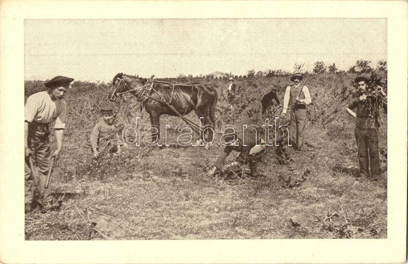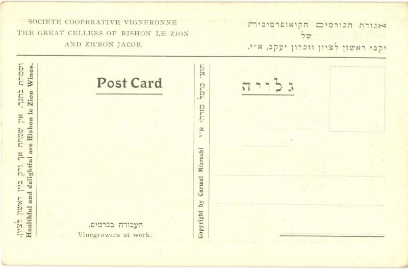 Societe Cooperative Vigneronne, The great Cellers of Rishon Le Zion and Zicron Jacob. Vinegrowers at work. Hebrew text, Judaica / Jewish Rishon le Zion Wines advertisement card