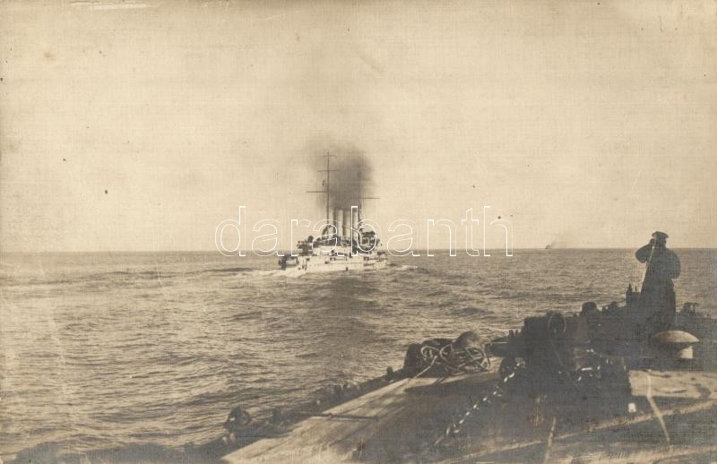 1916 SMS Sankt Georg, a K.u.K. haditengerészet páncélos cirkálója hazafelé Riminiből a vasúti híd szétlövése után / K.u.K. Kriegsmarine, SMS Sankt Georg heading home after bombing the railway bridge in Rimini, photo