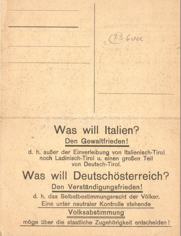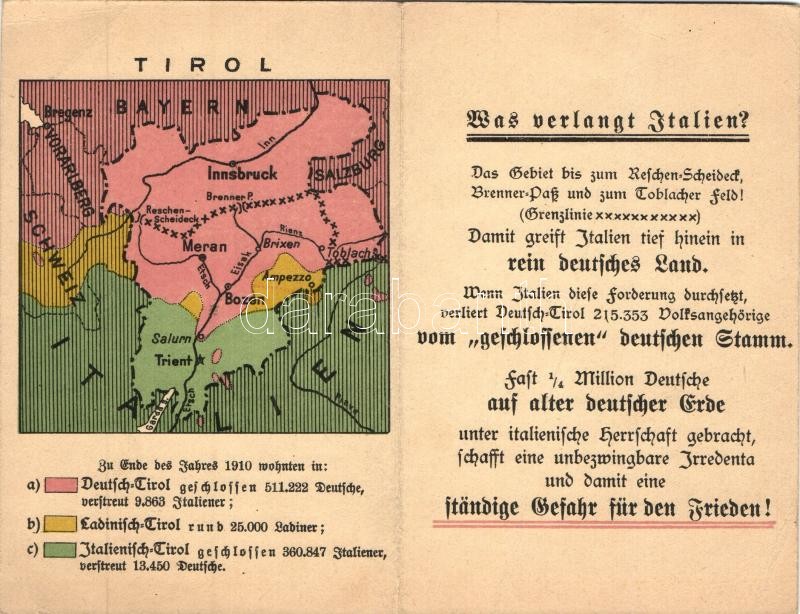 Was will Italien? Den Gewaltfrieden! Was will Deutschösterreich? Den Verständigungsfrieden! Deutsch-Tirol, Ladinisch-Tirol (Südtirol), Italienisch-Tirol / WWI Tyrol plebiscite foldable card, map, irredenta (fa)