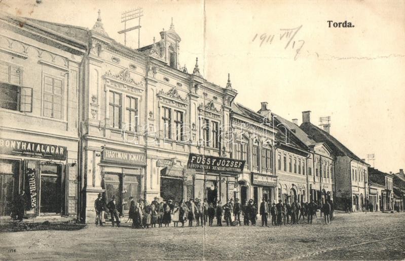 Torda, Turda; utcakép, Bonyhai Aladár, Hartman Ignácz, Pál Lajos és Amberg J. Miklós üzlete, Füssy József Könyvnyomdája és saját kiadása / street view with shops (fa)