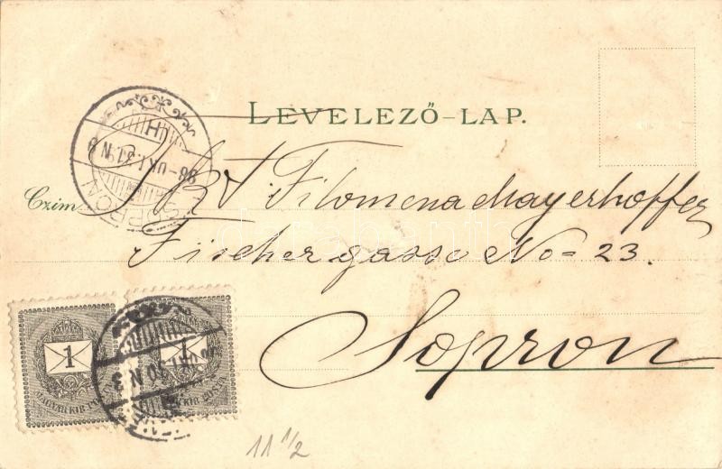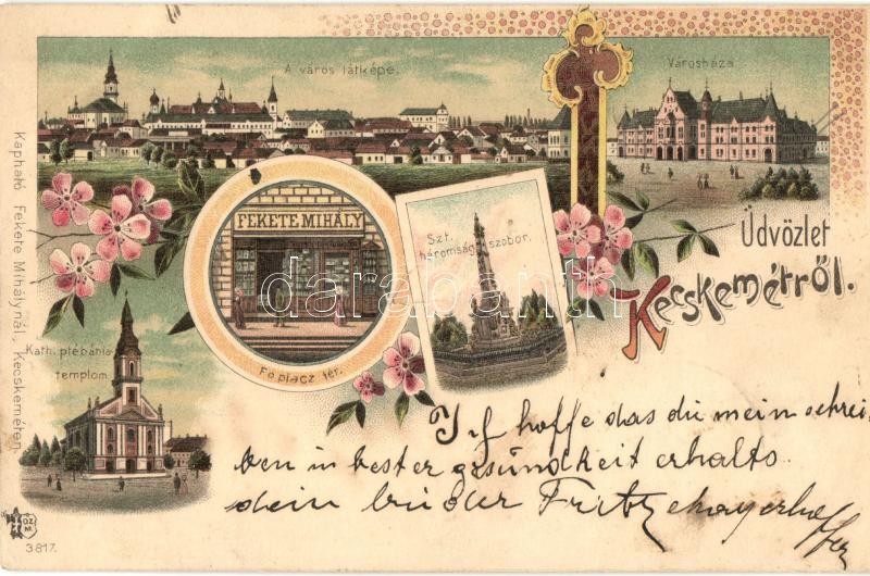 1898 Kecskemét, Városháza, Fő piac tér, Szentháromság szobor, katolikus Plébánia templom. Fekete Mihály üzlete és saját kiadású floral, Art Nouveau litho képeslapja (b)
