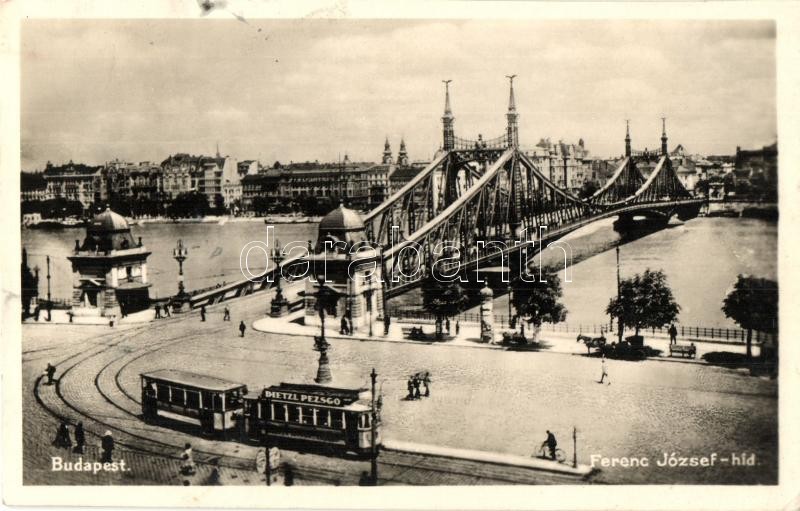 Budapest, Ferenc József híd, villamos Dietzl pezsgő reklámmal (EK) https://www.darabanth.com/de/306-Fernauktion/306.0/Ansichtskarten/Ungarn~300005/Budapest-Ferenc-Jozsef-hid-villamos-Dietzl-pezsgo-reklammal-EK~II1654060