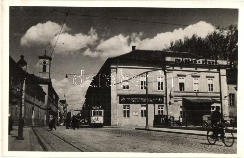 Beschreibung: Budapest II. Császár fürdő és szálló, villamos, kerékpár, automobil, Dreher sörök