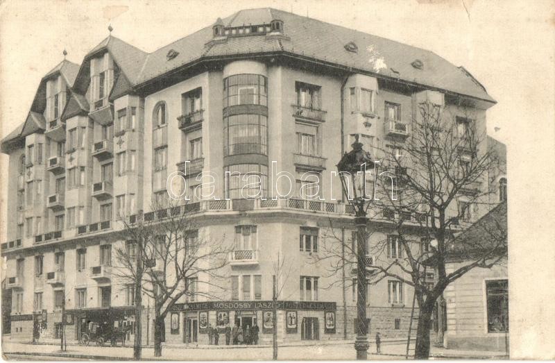 Beschreibung: Budapest II. Mosdóssy László fűszer és csemege üzlete a Szilágyi Erzsébet fasor és Nyúl utca sarkán. Mosdóssy László kiadása (ragasztónyom / gluemark)