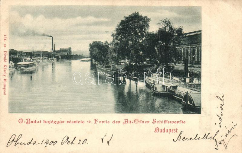 Beschreibung: Budapest III. Óbudai hajógyár, DDSG 208-as számú uszálya, Tachtalia gőzös, Divald Károly 134.