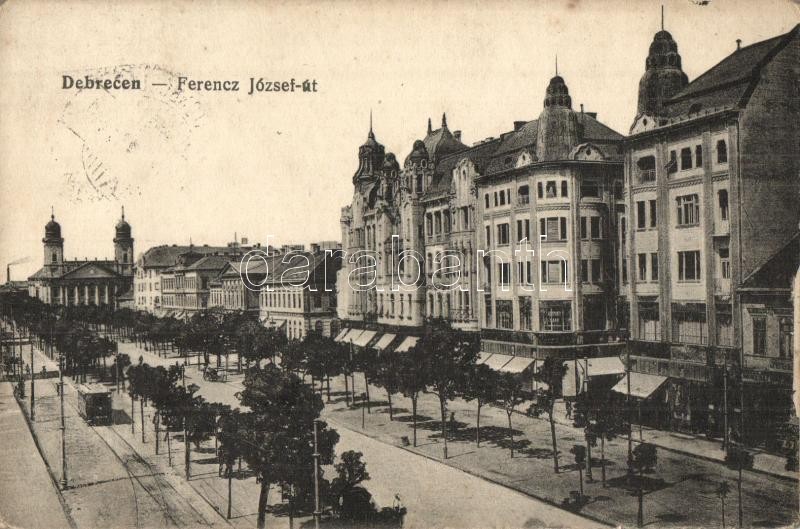 Debrecen, Ferenc József út, villamos https://www.darabanth.com/de/306-Fernauktion/306.0/Ansichtskarten/Ungarn~300005/Debrecen-Ferenc-Jozsef-ut-villamos~II1652679
