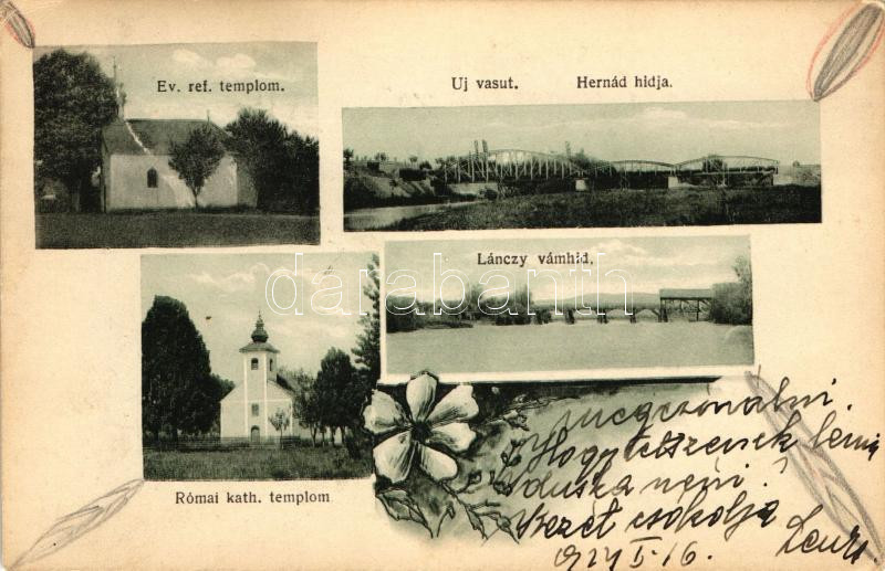 Beschreibung: Hidasnémeti, Római katolikus és Református templom, Hernád, vasúti híd, Lánczy vámhíd, floral
