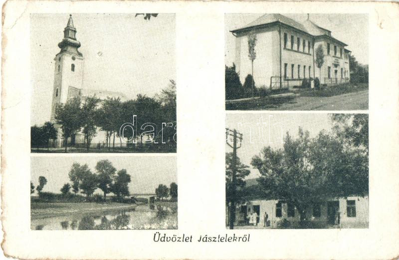 Beschreibung: Jásztelek, Római katolikus templom, üzlet, Hangya Szövetkezet kiadása (EK)