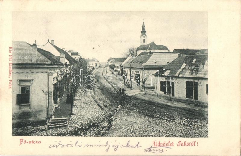 Beschreibung: Paks, Fő utca, templom, üzletek (EK)