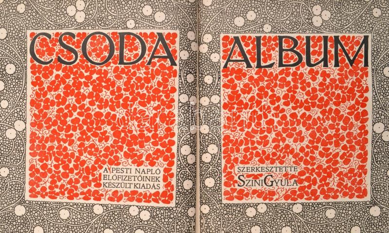 Csoda Album. Szerk.: Szini Gyula. A Pesti Napló előfizetőinek készült kiadás. Bp., 1911, Hornyánszky Viktor, 131 p.+ 12 t. (a táblák előtt feliratos hártyapapírral). Számos szövegközti és egész oldalas színes, szecessziós rajzzal és könyvdíszekkel illusztrálva. Dúsan aranyozott, festett, kiadói egészvászon kötésben, könyvjelzőjén a ,,Platschek árúház" reklámkártyájával. Krúdy Gyula, Hunyadi Sándor, Bródy Miksa, Szini Gyula, Cholnoky Viktor és mások írásaival. Jó állapotban.