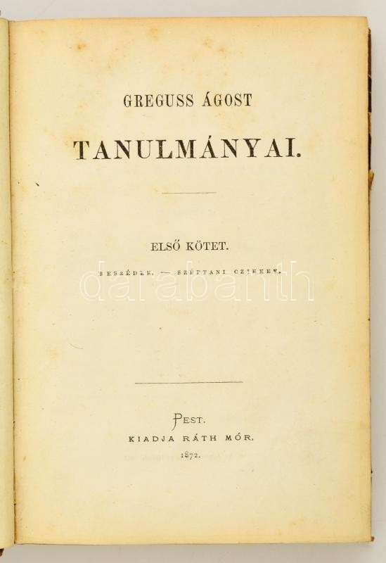 Greguss Ágost Tanulmányai I. kötet: Beszédek-Széptani cikkek. Pest, 18... https://www.darabanth.com/de/306-Fernauktion/306.0/Bucher/Bucher-Andere-kuriositaten~500018/Greguss-Agost-Tanulmanyai-I-kotet-Beszedek-Szeptani-cikkek-Pest-1872-Rath-Mor-AtkottC3~II1654731