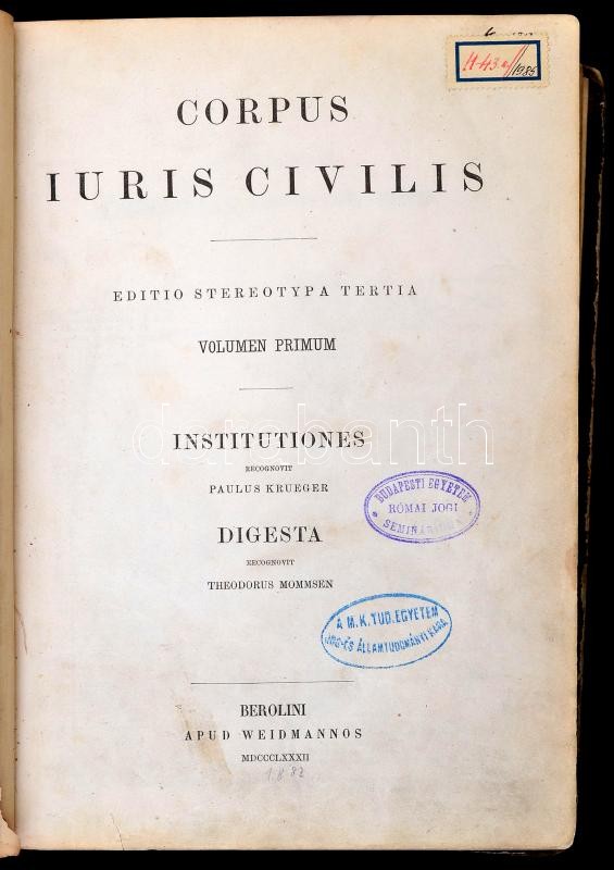 Corpus Iuris Civilis. I. kötet: Institutiones recognovit Paulus Krueger. Digesta recognovit Theodorus Mommsen. Berlin, 1882, Weidmann. Korabeli félbőr-kötés, sérült, hiányos gerinccel, kopottas borítóval, volt könyvtári példány, latin nyelven./ Half-leather-binding, with worn cover, and damaged spine, in Latin language.