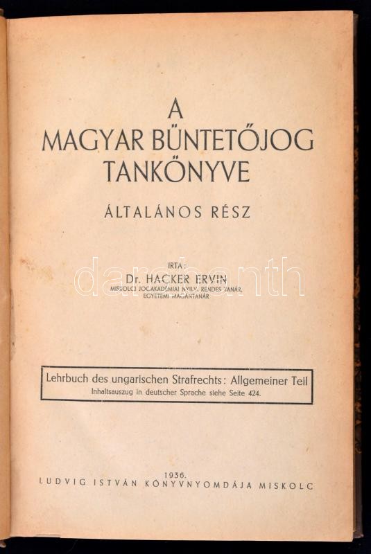 Dr. Hacker Ervin: A magyar büntetőjog tankönyve. Miskolc, 1936, Ludvig István Könyvnyomdája, XXIV+445 p. Korabeli félvászon-kötés, számos ceruzás aláhúzással, bejelöléssel, de alapvetően jó állapotban.