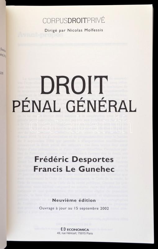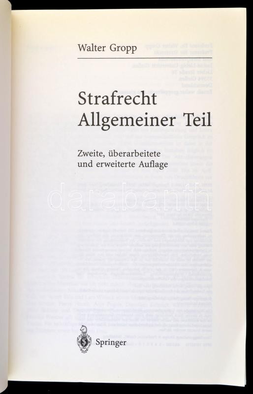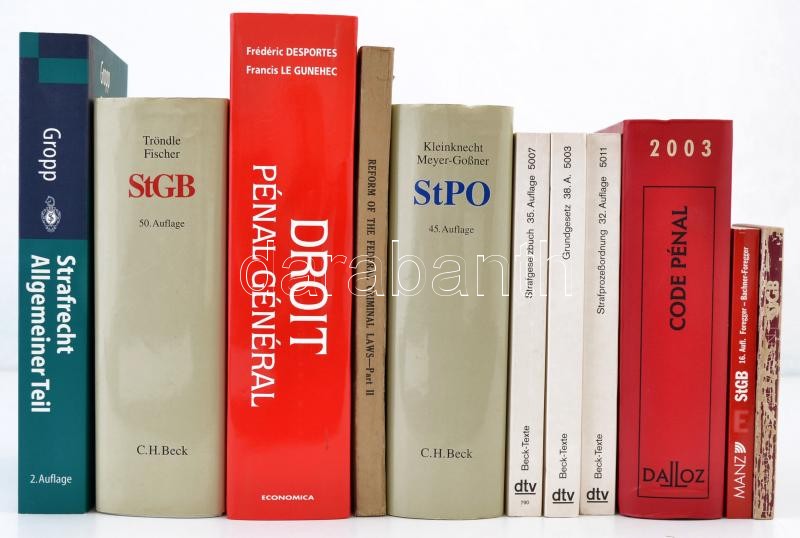 Vegyes idegen nyelvű jogi könyvtétel, főleg német nyelven, közte két francia, és egy angol nyelvű, jó állapotban, 11 db: Theodor Kleinknecht-Dr. Lutz Meyer-Goßner: Strapozeßordnung. Beck'sche Kurzkommentare 6. München, 2001, C.H. Beck. 45., új átdolgozott kiadás. Kiadói egészvászon-kötés, kiadói papír védőborítóban, német nyelven. Dr. Herbert Tröndle-Dr. Thomas Fischer: Strafgesetzbuch und Nebengesetze. Beck'sche Kurzkommentare 10. München, 2001, C.H. Beck. 50., új átdolgozott kiadás. Kiadói egészvászon-kötés, kiadói papír védőborítóban, német nyelven. Strafgesetzbuch. München, 2000, Deutscher Taschenbuch Verlag. 35. kiadás. Kiadói papírkötés, német nyelven. Strafporzeßordnung. München, 2001, Deutscher Taschenbuch Verlag. 32. kiadás. Kiadói papírkötés, német nyelven. Grundgesetz. München, 2003, Deutscher Taschenbuch Verlag. 38. kiadás. Kiadói papírkötés, német nyelven. Strafgesetzbuch. Szerk.: Dr. Egmont Foregger-Dr. Helene Bachner-Foregger. Wien, 2002, Manz. Kiadói papírkötés, német nyelven. Strafgesetzbuch. Szerk.: Dr. Egmont Foregger-Dr. Eugen Serini. Wien,1975, Manz. Kiadói papírkötés, német nyelven. Walter Gropp: Strafrecht Allgemeiner Teil. Berlin-Heidelberg, 2001, Springer. Második, átdolgozott és felülvizsgált kiadás. Kiadói papírkötés, német nyelven. Fréderic Desportes-Francis Le Gunehec: Droit Pénal Général. Paris, 2002, Economica. Kilencedik kiadás. Kiadói papírkötés, francia nyelven. Code Pénal. Szerk.: Yves Mayaud. Paris, 2003, Dalloz. Kiadói papírkötés, francia nyelven. 100. kiadás. Hearings before the subcommittee on criminal laws procedures of the committee on the judiciary United States Senate ninety-second congress. Part II. State Experience. Reform of the Federal Criminal Laws. Washington, 2001, U.S. Government Printing Officie. Kiadói papírkötés, angol nyelven./ Mixed law books,10 pieces, in German, English and French languages, in good condition.