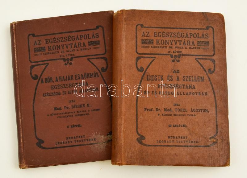 Egészségápolás könyvtára 2 kötete (IV., XII. kötetek): Dr. Forel Ágoston: Az idegek és a szellem egészségtana ép és beteg állapotban. Dr. Riecke E.: A bőr, a hajak és a körmök egészségtana egészséges és beteg állapotban. Bp., é.n., Légrády. Kiadói kissé kopottas egészvászon-kötés.