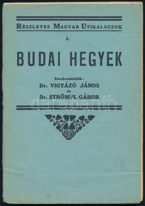 Budai hegyek. Részletes Magyar Útikalauzok 1. Szerk.: Dr. Vigyázó János, Dr. Strömpl Gábor. Bp., 1934, Turistaság és Alpinizmus. 3. kiadás. Kiadói papírkötés, a borítója szakadozott, a könyvtest elvált a borítótól, egy színes kihajtható térképpel.