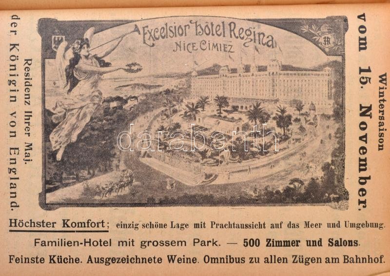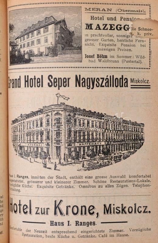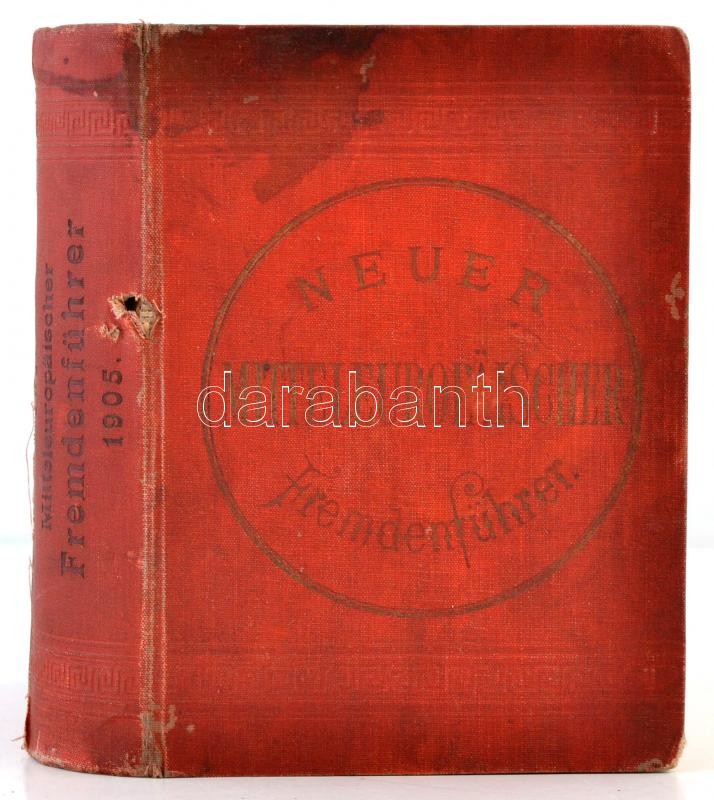 Neuer Mitteleuropäischer Fremdenführer Handbuich für Reisende durch Deutschland, Östereich-Ungarn, Ober-Italien inkl. Rom und Neapel, die Riviera (mit Ausflug nach Paris), Belgien und Holland. XXIV. Jahrgang. Ausgabe Nr. 282. Bp., 1905, Rudolf E. Kostelezky, 1+2+578+74+L p. Kiadói vörös egészvászon-kötés, a hátsó borítón hotel reklámmal, kopottas, foltos borítóval, sérült gerinccel, a címoldal és az azt követő lap kijár, 332 oldal szakadt, rajta korabeli javítással, számos térképpel, hátul regiszterrel, rengeteg korabeli hotel reklámmal, német nyelven./ Neuer Mitteleuropäischer Fremdenführer Handbuich für Reisende durch Deutschland, Östereich-Ungarn, Ober-Italien inkl. Rom und Neapel, die Riviera (mit Ausflug nach Paris), Belgien und Holland. XXIV. Jahrgang. Ausgabe Nr. 282. Bp., 1905, Rudolf E. Kostelezky, 1+2+578+74+L p. Linen-binding, with worn and spotty cover, with a damaged binding, the front and the next pages are coming out, the 332 page is raunchy, with contemporary reaparing, with a lot of maps, with register on the back, with many hotel advertisment, in German language.