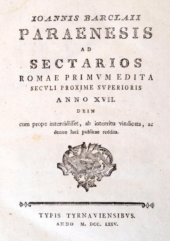 Ioannis Barclaii (John Barclay (1582-1621)): Paraenesis ad Sectarios. [Tyrnaviae (Nagyszombat)], 1775, Typis Tyrnaviensibus. 10 sztl. lev+356 p. Korabeli papírkötés, festett lapélekkel, kopott borítóval, kopott, foltos, fakó gerinccel, latin nyelven. John Barclay skót író, költő protestánsok ellen íródott művének nagyszombati kiadása. / Paperbinding, with worn cover and worn and spotty spine in Latin language.