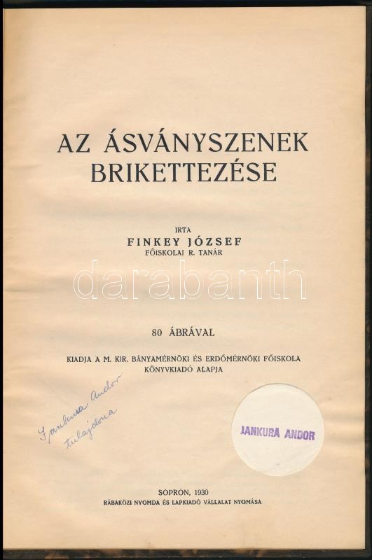 Finkey József: Az ásványszenek brikettezése. Sopron, 1930, Rábaközi Nyomda és Lapkiadó Vállalat. Kiadja a M. Kir. Bányamérnöki és Erdőmérnöki Főiskola Könykiadó Alapja. Korabeli félvászon-kötés.