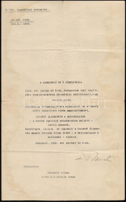 Hungary 1941. "Hungarian Bronze Medal with the Holy Crown on a war ribbon with swords" decoration document with original signature of vitéz Bartha Károly (Royal Hungarian Minister of Defence) C:F tear alongside the fold