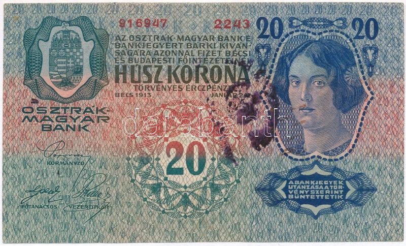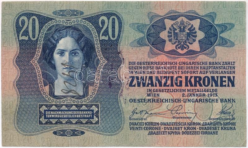 1913. 20K kiolvashatatlan felülbélyegzéssel, kézírásos megjegyzéssel T... https://www.darabanth.com/de/306-Fernauktion/306.0/Numismatik/Ungarische-Banknoten~200007/1913-20K-kiolvashatatlan-felulbelyegzessel-kezirasos-megjegyzessel-TII-szep-ropogos-pap~II1656917
