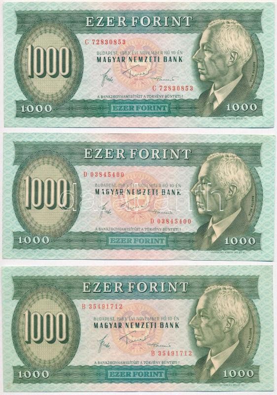 1983. november 10. 1000Ft (3x) "B", "C" és "D... https://www.darabanth.com/de/306-Fernauktion/306.0/Numismatik/Ungarische-Banknoten~200007/1983-november-10-1000Ft-3x-B-C-es-D-sorozatjelek-TIII-szep-ropogos-papir~II1653040