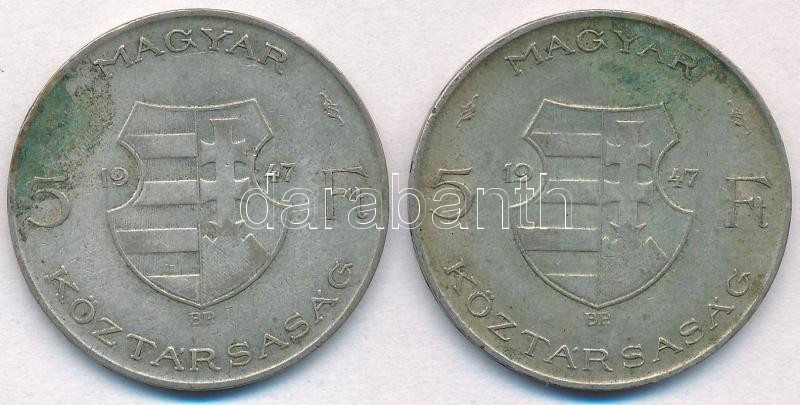 1947. 5Ft Ag "Kossuth" (2x) T:2-,3 patina https://www.darabanth.com/de/306-Fernauktion/306.0/Numismatik/Ungarische-Munzen-und-Munzen-mit-ungarischem-Munzzeichen~200008/1947-5Ft-Ag-Kossuth-2x-T2-3-patina~II1652074