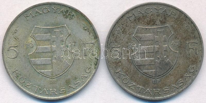 1947. 5Ft Ag "Kossuth" (2x) T:2-,3 patina https://www.darabanth.com/de/306-Fernauktion/306.0/Numismatik/Ungarische-Munzen-und-Munzen-mit-ungarischem-Munzzeichen~200008/1947-5Ft-Ag-Kossuth-2x-T2-3-patina~II1652075