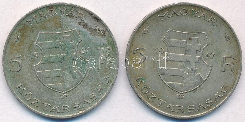 1947. 5Ft Ag "Kossuth" (2x) T:2- patina https://www.darabanth.com/de/306-Fernauktion/306.0/Numismatik/Ungarische-Munzen-und-Munzen-mit-ungarischem-Munzzeichen~200008/1947-5Ft-Ag-Kossuth-2x-T2-patina~II1652073