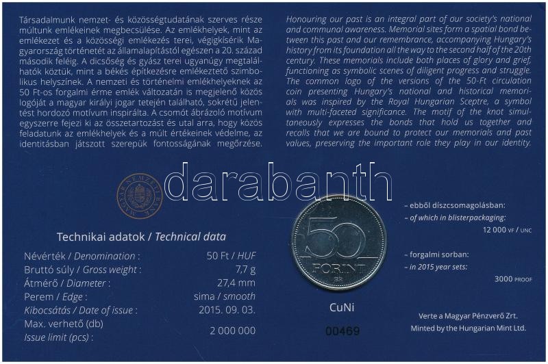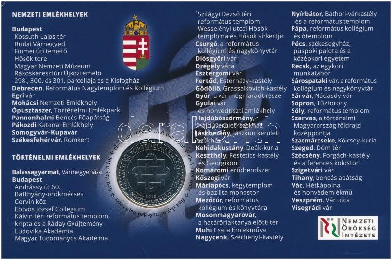 2015. 50Ft Cu-Ni "Nemzeti és Történelmi Emlékhelyek" első na... https://www.darabanth.com/de/306-Fernauktion/306.0/Numismatik/Ungarische-Munzen-und-Munzen-mit-ungarischem-Munzzeichen~200008/2015-50Ft-Cu-Ni-Nemzeti-es-Tortenelmi-Emlekhelyek-elso-napi-veret-szamozott-emleklapon-T1~II1650806