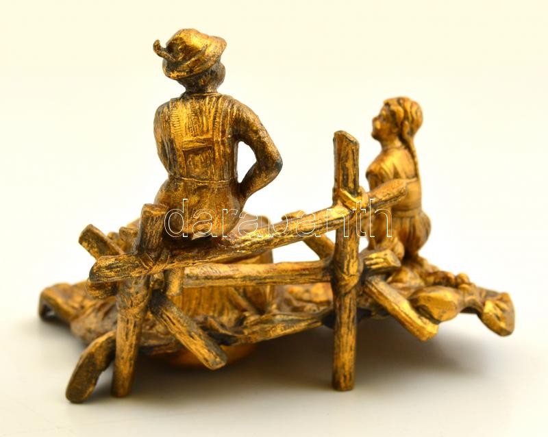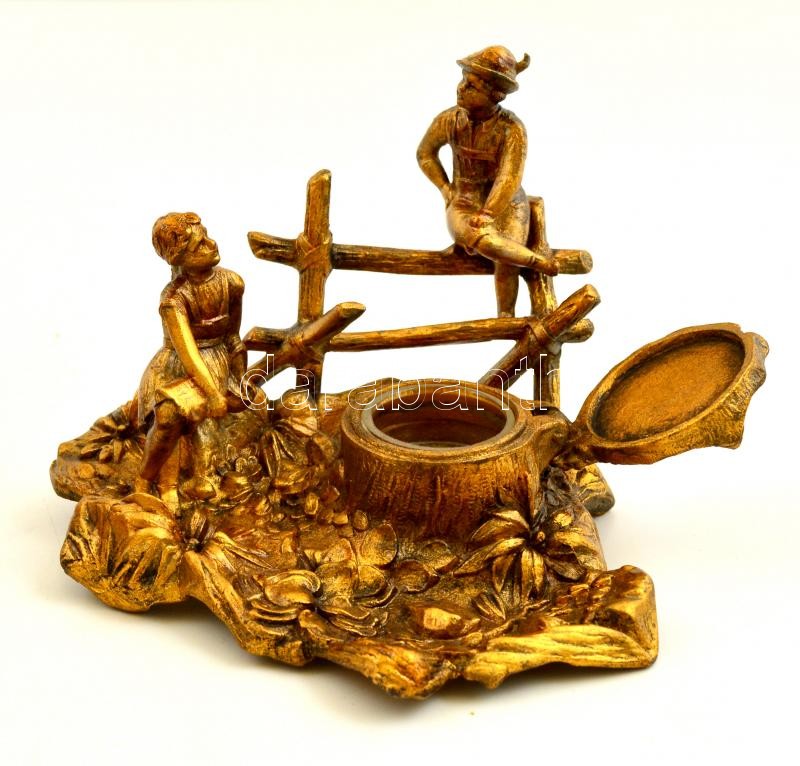 Beschreibung: cca 1900 figurális tintatartó, bronzírózott spiáter, jelzés nélkül, eredeti üveg betéttel, 16×11 cm, m:11 cm
