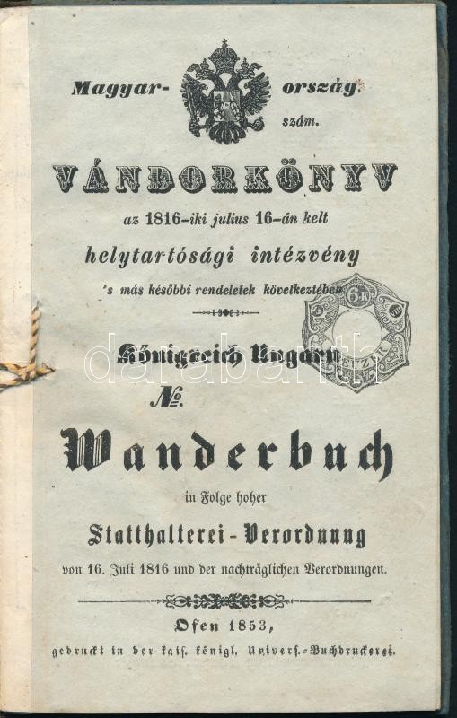 1853 Vándorlókönyv két nyelven, néhány bejegyzéssel 6kr szignettával https://www.darabanth.com/de/307-Fernauktion/307.0/Andere-Sammelgebiete/Dokument~17/1853-Vandorlokonyv-ket-nyelven-nehany-bejegyzessel-6kr-szignettaval~II1591101