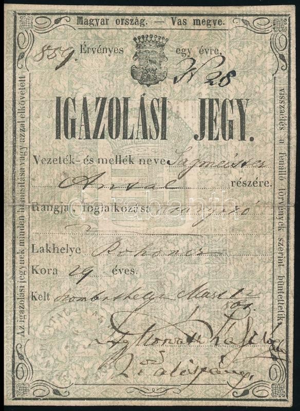 1861 Igazolási jegy rohonci lakos részére / German-Hungarian ID for Re... https://www.darabanth.com/de/307-Fernauktion/307.0/Andere-Sammelgebiete/Dokument~17/1861-Igazolasi-jegy-rohonci-lakos-reszere-German-Hungarian-ID-for-Reichnitz-trader~II1626033
