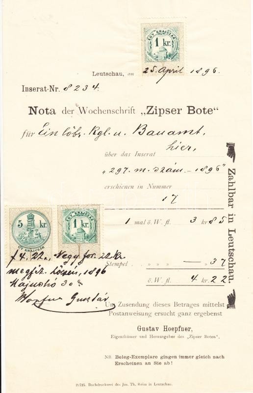 Beschreibung: 1896 Lőcse(Felvidék), Hirdetési számla a "Zipser Bote" által kiállítva, 3 db okmánybélyeggel, szép állapotban