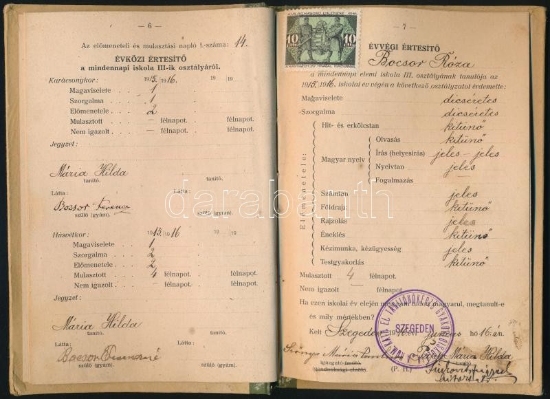 1913 Szeged, elemi népiskolai értesítő, hadisegély bélyeggel https://www.darabanth.com/de/307-Fernauktion/307.0/Andere-Sammelgebiete/Dokument~17/1913-Szeged-elemi-nepiskolai-ertesito-hadisegely-belyeggel~II1660723