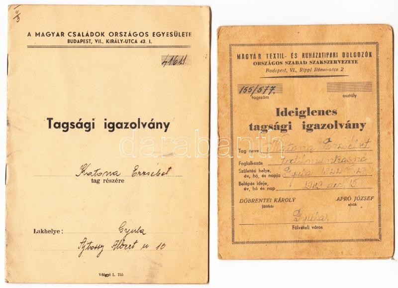1940-1950 2 db Tagsági Igazolvány, Magyar Textil és Ruházatipari Dolgozók Országos Szabad szakszervezete, Magyar Családok Országos Egyesülete, bélyegekkel