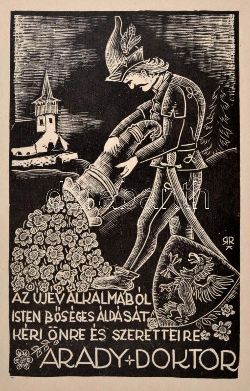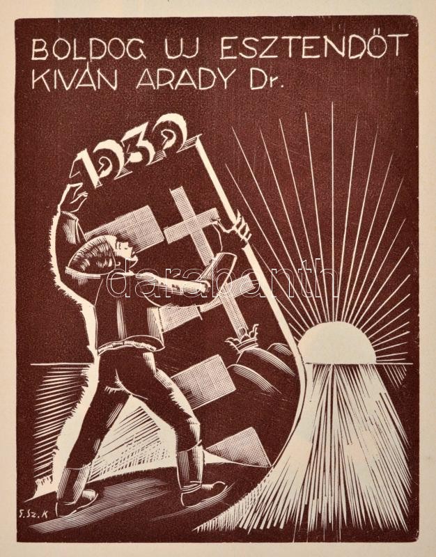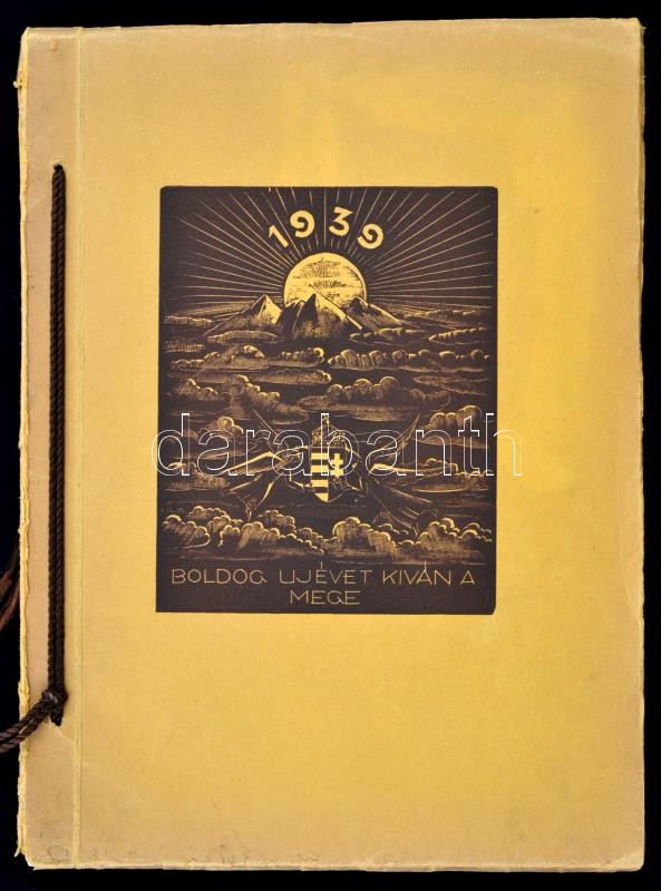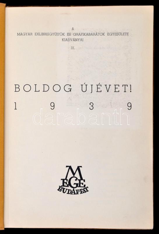 Boldog újévet kíván a MEGE! 1939. Bp. 1938. MEGE. 2 lev. 41 t. A Magyar Exlibrisgyűjtők és Grafikabarátok Egyesülete kiadványai 9. Fűzve, illusztrált, zsinórral átfűzött kiadói borítékban. A kiadvány megjelent 170 példányban, ez számozatlan. Többek között Bordás Ferenc, Gáborjáni Szabó Kálmán, Fery Antal, Gebhardt Tibor, Haranghy Jenő, Vadász Endre és Márton Lajos metszeteivel. A lapok egy része szignálva. Jó állapotban.